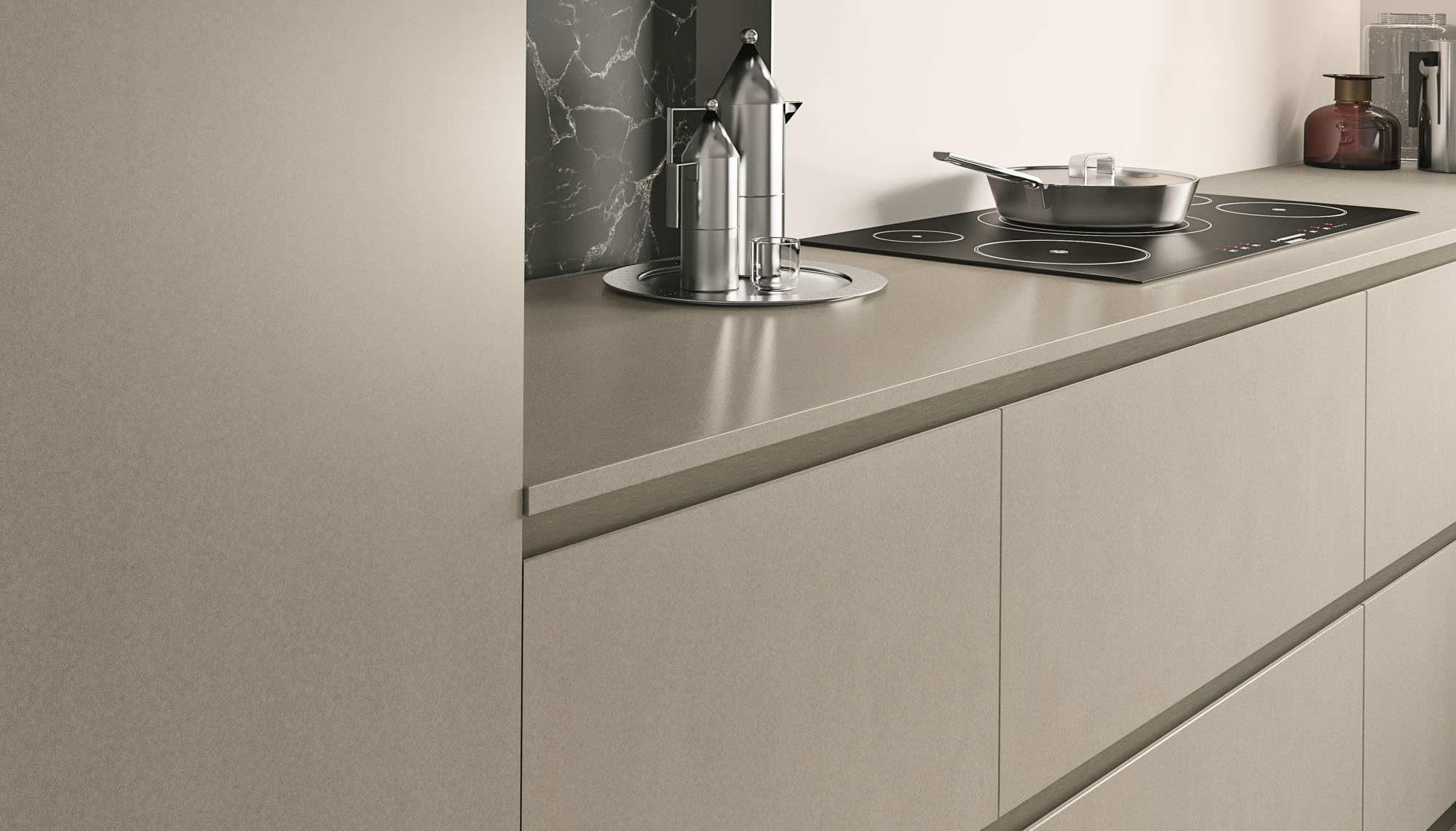 RKS 0.5 Many flavours can be found in one kitchen, each with its own characteristics. Base units, wall units and worktop have a new stone finish. Wall units have polished glass doors. Tall units feature transparent glass. The marble effect of the hood and shelves are the perfect match for the Fenix finish of the open-front end unit.